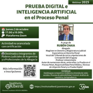 La actividad está destinada a integrantes de Poderes Judiciales de Argentina y a profesionales de la abogacía, que deberán inscribirse previamente en https://institutoalberdi.jusentrerios.gov.ar/events/webinar-prueba-digital-e-inteligencia-artificial-en-el-proceso-penal/