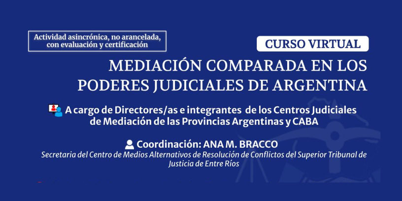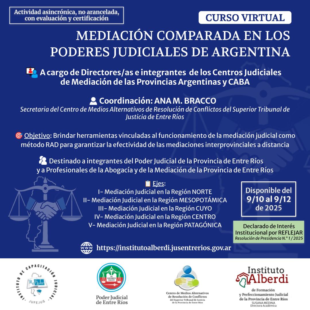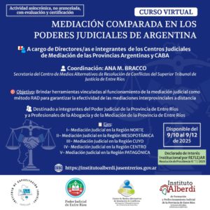 Las inscripciones se realizan de manera online en https://institutoalberdi.jusentrerios.gov.ar/events/curso-virtual-mediacion-comparada-en-los-poderes-judiciales-de-argentina/