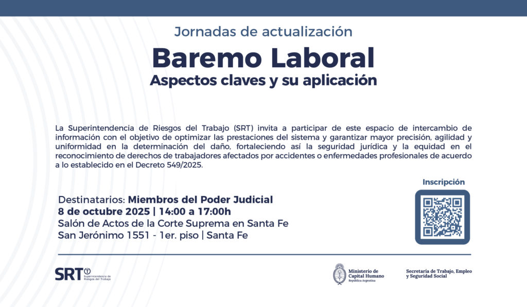 La Jornada es organizada por la Superintendencia de Riesgo del Trabajo, el Ministerio de Capital Humano y la Secretaría de Trabajo, Empleo y Seguridad Social de la Nación, y se llevará a cabo los días 7 y 8 de octubre próximo, en la sede de la Corte Suprema de Justicia de Santa Fe.