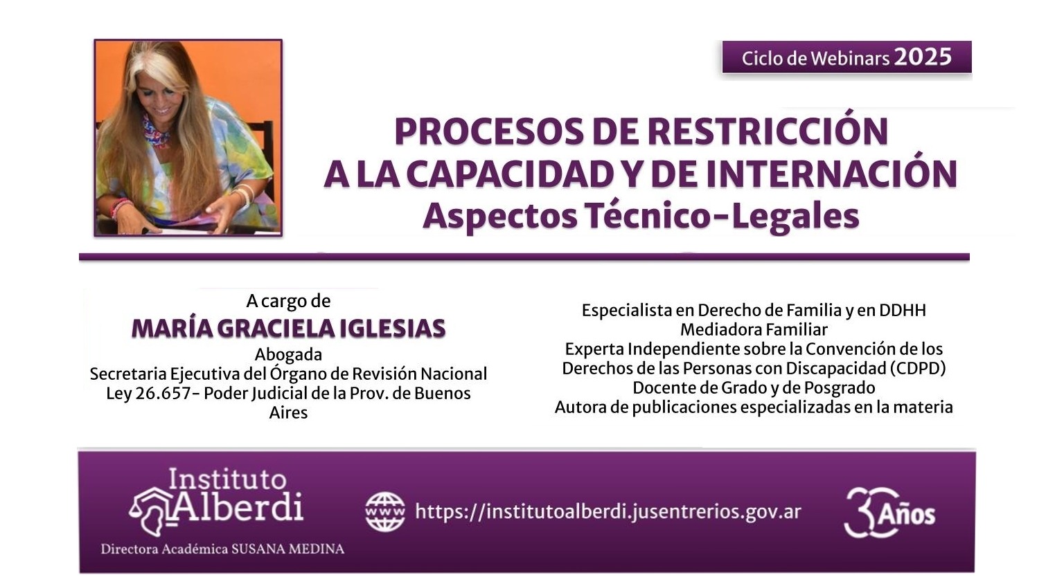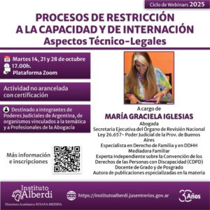 Las inscripciones se realizan de manera online en https://institutoalberdi.jusentrerios.gov.ar/events/ciclo-de-webinars-procesos-de-restriccion-a-la-capacidad-y-de-internacion-aspectos-tecnico-legales/