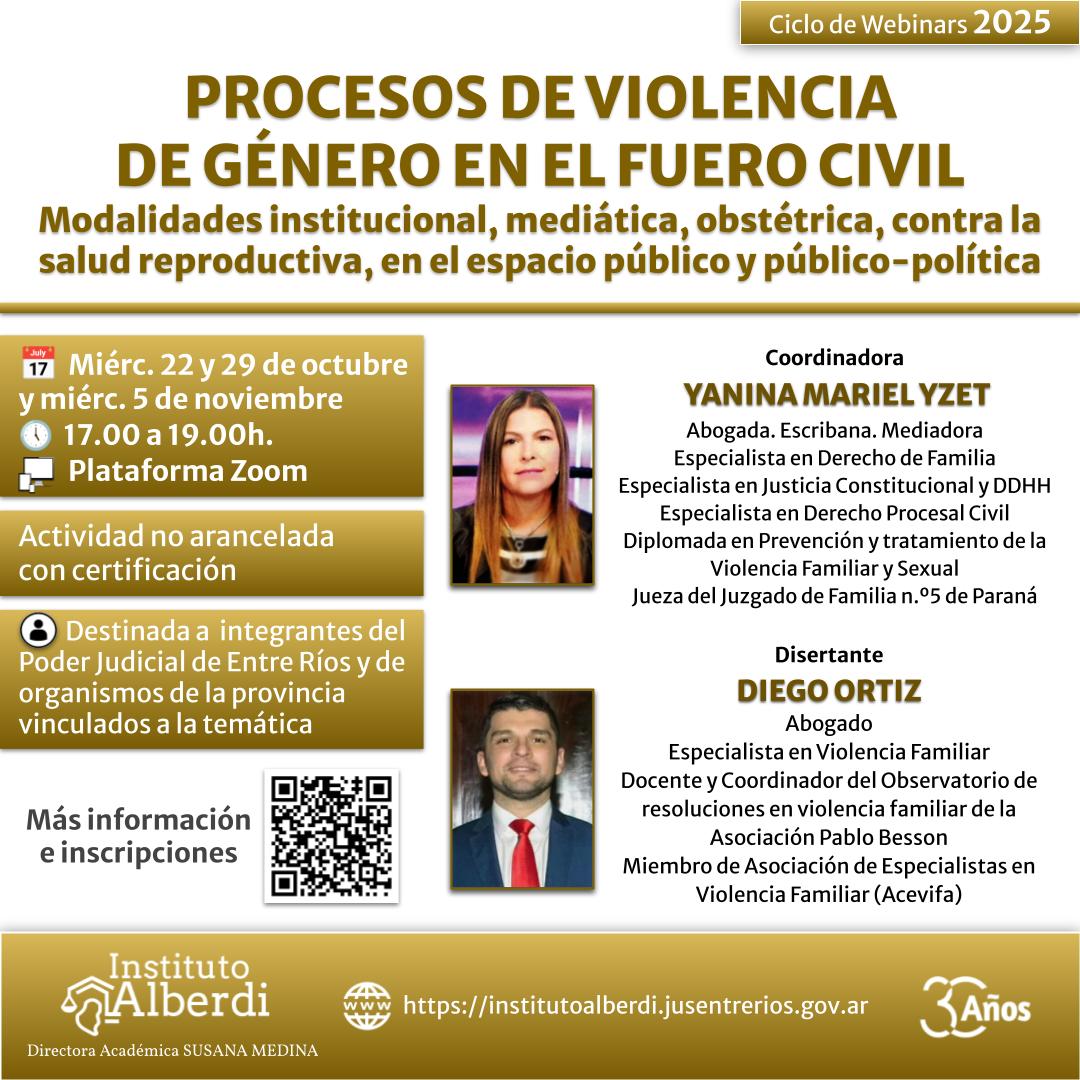 Las inscripciones se realizan de manera online en https://institutoalberdi.jusentrerios.gov.ar/events/ciclo-de-webinars-procesos-de-violencia-de-genero-en-el-fuero-civil/