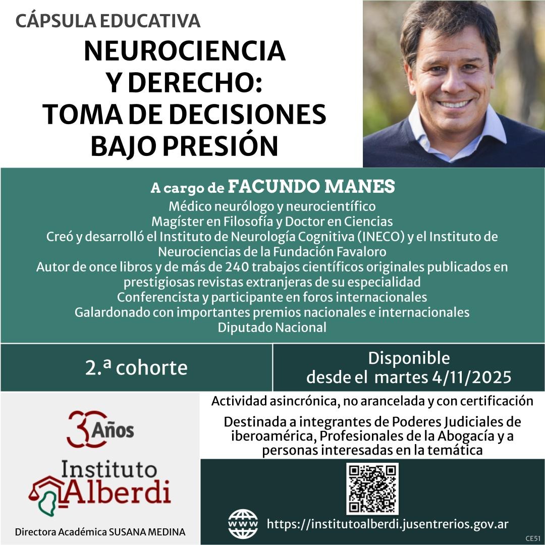 Las inscripciones se realizan en https://institutoalberdi.jusentrerios.gov.ar/events/capsula-educativa-neurociencia-y-derecho-toma-de-decisiones-bajo-presion/