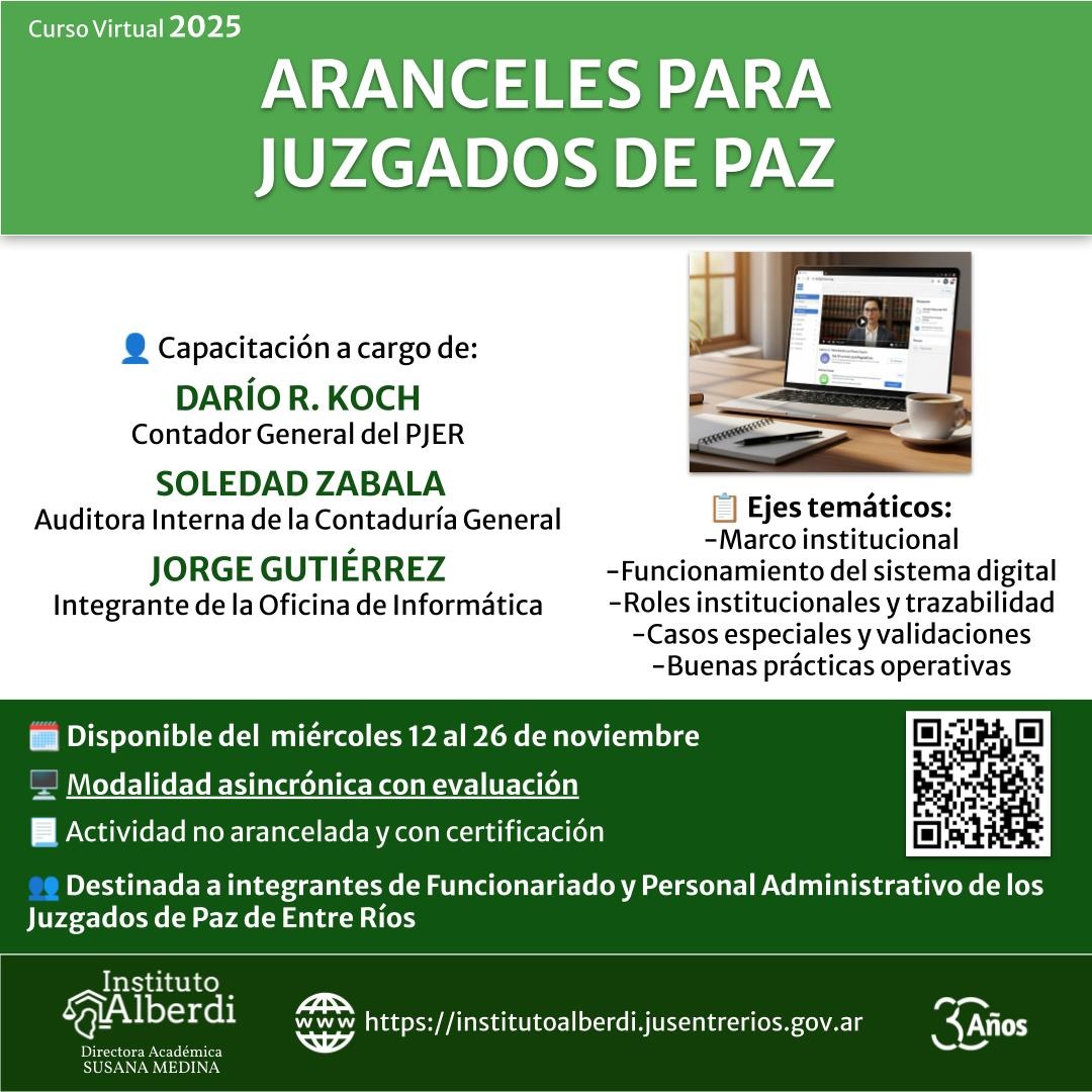 Las inscripciones se realizan de manera online en https://institutoalberdi.jusentrerios.gov.ar/events/curso-virtual-aranceles-para-juzgados-de-paz/