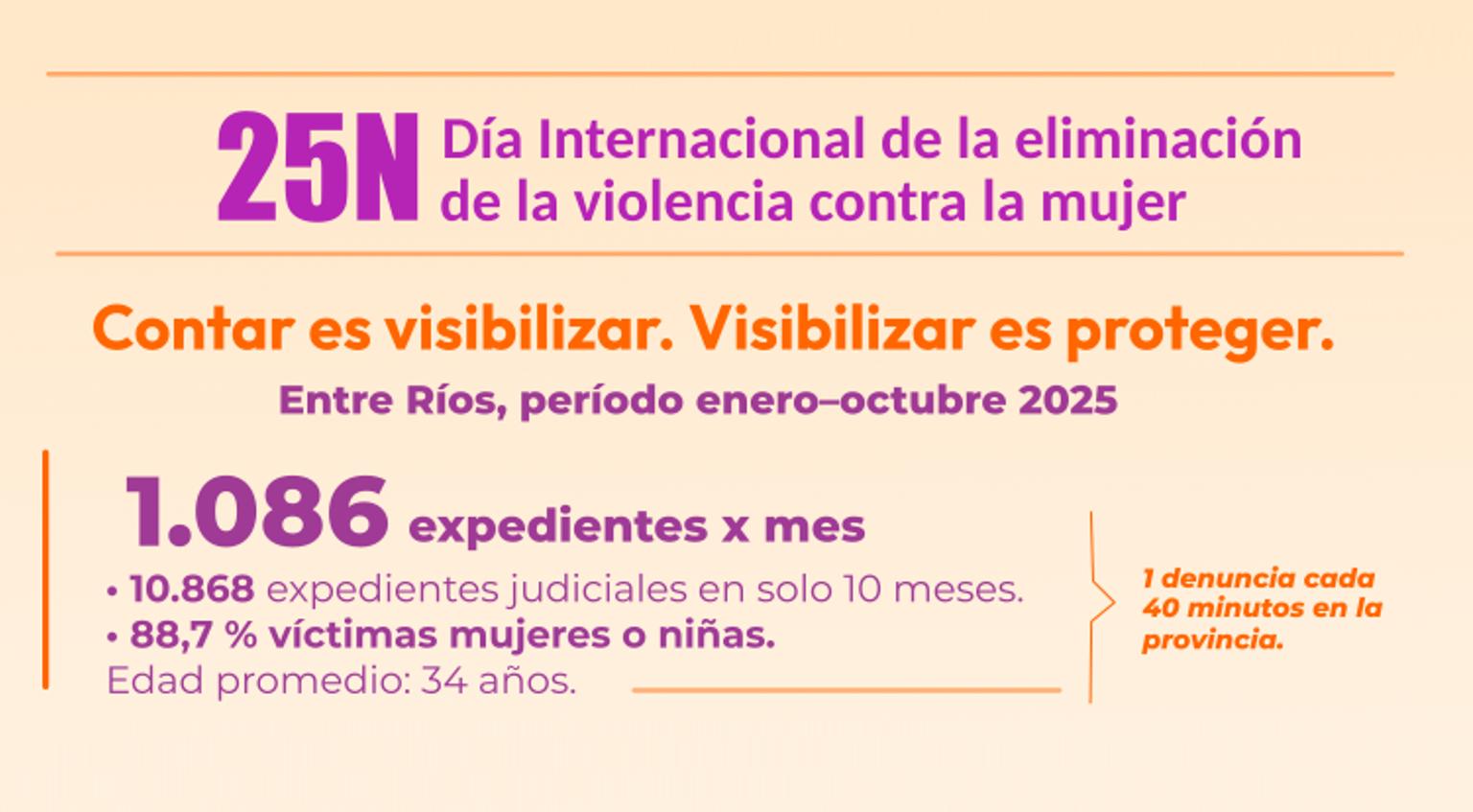 En el marco del Día Internacional de la Eliminación de la Violencia contra la Mujer (25N), la Oficina de Violencia de Género (OVG) del Superior Tribunal de Justicia de Entre Ríos difundió un informe el cual indica que entre enero y octubre de 2025 se registraron 10.868 expedientes judiciales, lo que equivale a un promedio de 1.086 casos por mes.