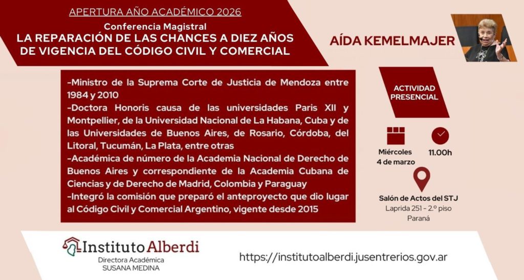 El próximo 4 de marzo a las 11, se realizará el acto de apertura del año académico 2026 del Instituto de Formación y Perfeccionamiento Judicial “Dr. Juan Bautista Alberdi”. La conferencia magistral, para inaugurar el ciclo, estará a cargo de Aída Kemelmajer, quien disertará sobre “La reparación de las chances a diez años de vigencia […]