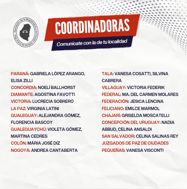 En tanto, la convocatoria en Nogoyá es el próximo martes a las 12 en el edificio de Tribunales; en Federación para el lunes 2 a las 9 en San Martín y Las Hortencias y en Concordia para el martes 3 a las 7.30 en la explanada Tribunales, Mitre 26/28.