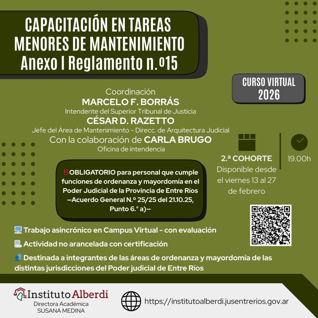 Quienes deseen participar deben inscribirse en el siguiente enlace: https://institutoalberdi.jusentrerios.gov.ar/events/curso-virtual-capacitacion-en-tareas-menores-de-mantenimiento-anexo-i-reglamento-n-o15/