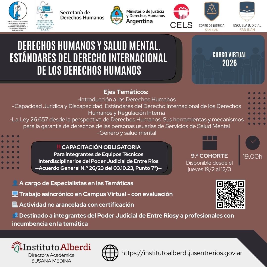 Las inscripciones y el programa pueden encontrarse en https://institutoalberdi.jusentrerios.gov.ar/events/curso-virtual-derechos-humanos-y-salud-mental-estandares-del-derecho-internacional-de-los-derechos-humanos-2026/