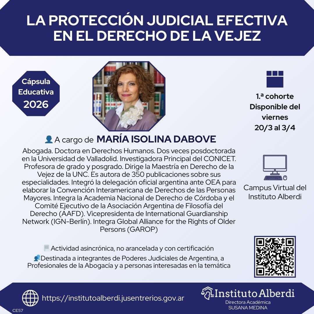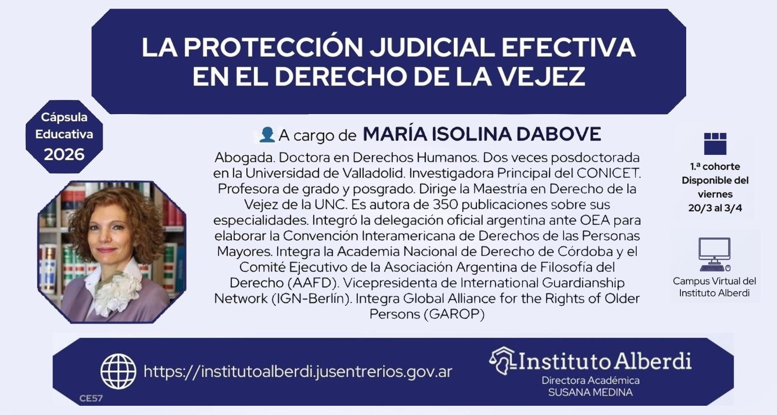 Las inscripciones se realizan de manera online en https://institutoalberdi.jusentrerios.gov.ar/events/capsula-educativa-la-proteccion-judicial-efectiva-en-el-derecho-de-la-vejez/