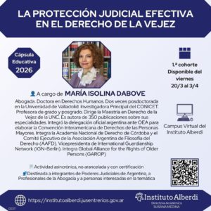 Desde el 20 de marzo a las 19, hasta el 3 de abril a las 23:59, estará disponible la primera cohorte de la cápsula educativa sobre la protección judicial efectiva en el derecho a la vejez. Estará a cargo de la doctora en Derechos Humanos; dos veces posdoctorada en la Universidad de Valladolid; investigadora principal del CONICET.; profesora de grado y posgrado y directora de la Maestría en Derecho de la Vejez de la UNC, María Isolina Dabove.