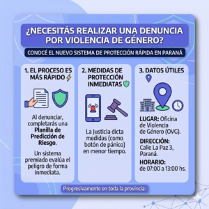 Las mujeres  que necesiten o deseen realizar una denuncia o redenuncia  en el marco de la ley , podrán dirigirse a la Oficina de Violencia de Género – OVG- del STJ, en calle La Paz 3, Paraná, en el horario comprendido de 7 a 13 hs donde un profesional integrante de ese organismo, recepcionará su denuncia y tras ella, será incorporada al Sistema Integral de Abordaje de las Violencias (SIAV) mediante una planilla de Predicción de Riesgo.