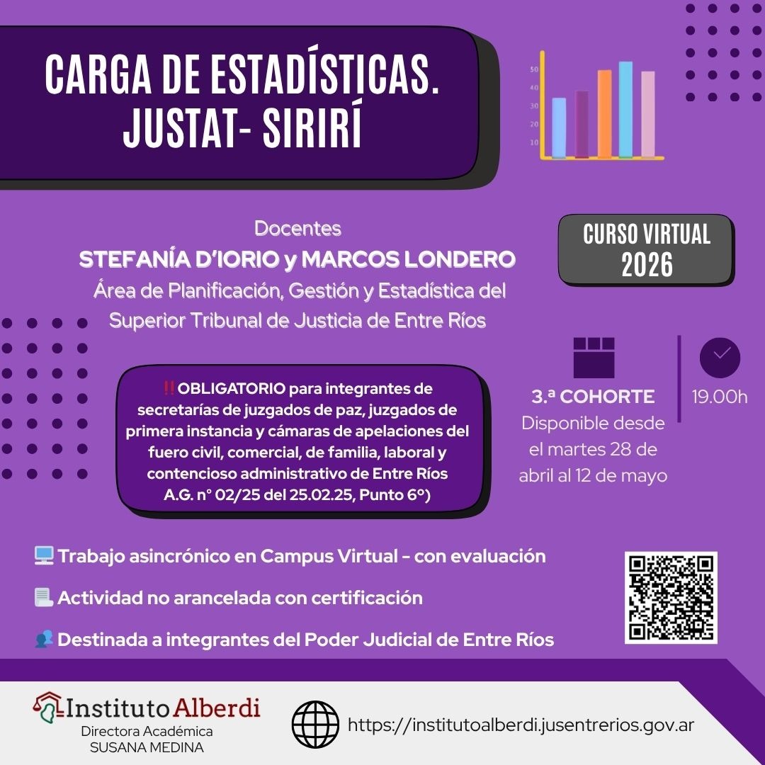 Las inscripciones se realizan en https://institutoalberdi.jusentrerios.gov.ar/events/curso-virtual-carga-de-estadisticas-justat-siriri/