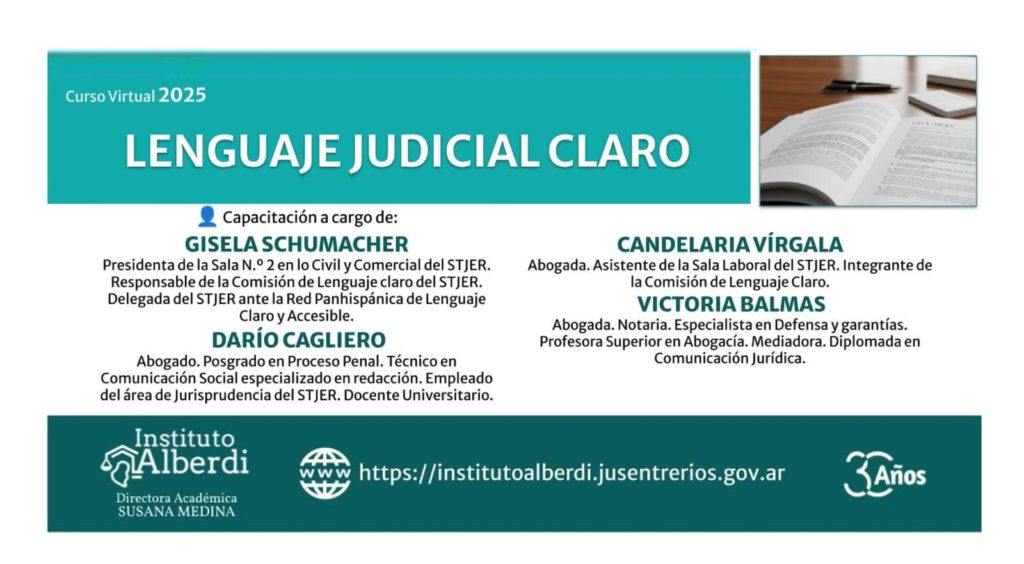Desde el martes 11 de noviembre, a las 19, hasta el 2 de diciembre de 2025, a las 23:59, estará disponible el curso virtual asincrónico y con evaluación sobre lenguaje judicial claro, destinado a integrantes del Poder Judicial de Entre Ríos. La capacitación estará a cargo de la presidenta de la Sala Nº 2 […]