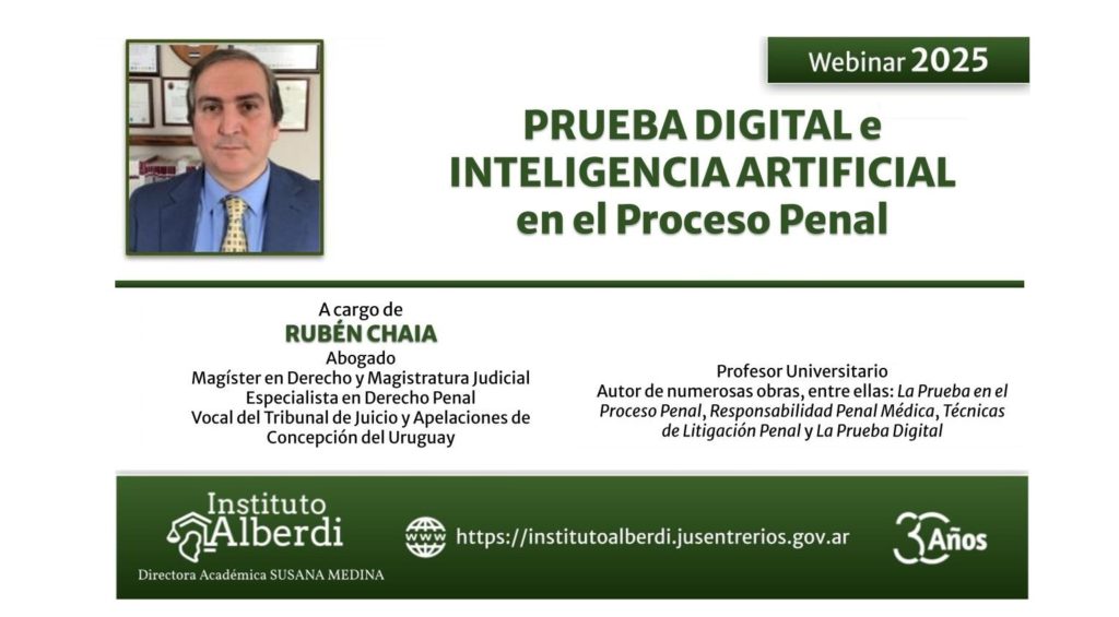 El próximo jueves 2 de octubre el vocal del Tribunal de Juicio y Apelaciones de Concepción del Uruguay, Rubén Chaia, dictará un webinar sobre la “Prueba Digital e Inteligencia Artificial en el Proceso Penal”. Se transmitirá por la Plataforma ZOOM, de 17 a 19. Los temas que se tratarán son el desbloqueo compulsivo; la […]