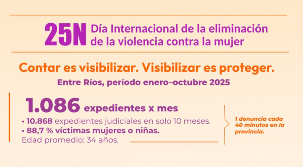 En el marco del Día Internacional de la Eliminación de la Violencia contra la Mujer (25N), la Oficina de Violencia de Género (OVG) del Superior Tribunal de Justicia de Entre Ríos difundió un informe el cual indica que entre enero y octubre de 2025 se registraron 10.868 expedientes judiciales, lo que equivale a un promedio […]