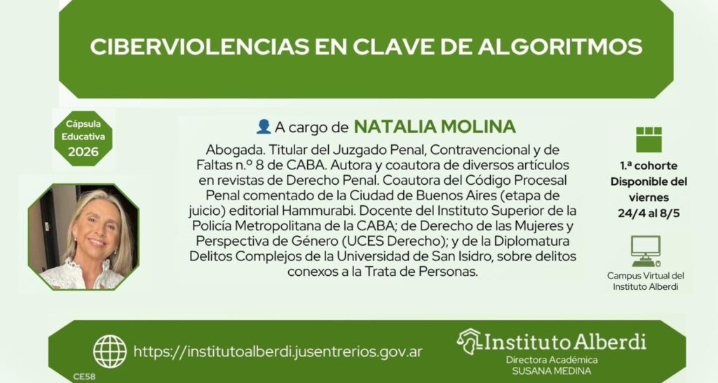 Desde el próximo viernes 24 de abril a las 19 y hasta el 8 de mayo a las 23:59, estará disponible en el campus virtual del Instituto “Dr. Juan Bautista Alberdi”, la 1ra. cohorte de la cápsula educativa sobre ciberviolencias en clave de algoritmos, a cargo de la titular del Juzgado Penal, Contravencional y de […]