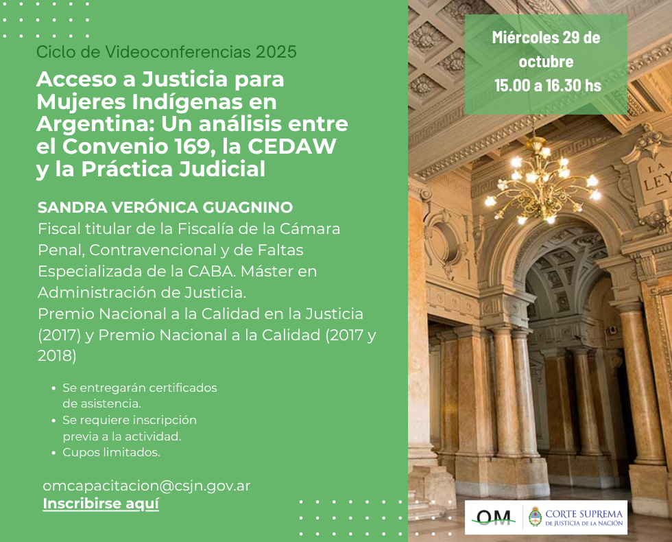 Desde la Oficina de la Mujer (OM) del Superior Tribunal de Justicia de Entre Ríos tenemos el agrado de invitarla/o a la videoconferencia, organizada por la OM de la Corte Suprema de Justicia de la Nación, sobre “Acceso a Justicia para Mujeres Indígenas en Argentina: Un análisis entre el Convenio 169, la CEDAW y la práctica judicial”. a cargo de la expositora Dra. Sandra Verónica Guagnino.