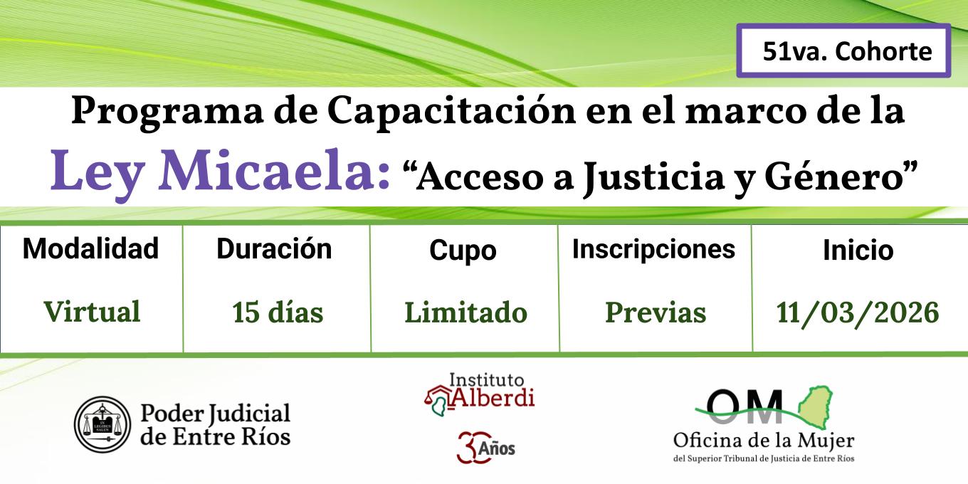 Invitamos a participar de la 51va. Cohorte del PROGRAMA DE CAPACITACIÓN OBLIGATORIA EN EL MARCO DE LA LEY MICAELA “ACCESO A JUSTICIA Y GÉNERO” organizado por la Oficina de la Mujer (OM) de Entre Ríos junto con el Instituto de Perfeccionamiento “Dr. Juan Bautista Alberdi” del Superior Tribunal de Justicia de Entre Ríos.