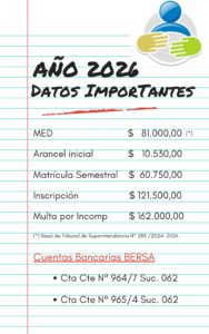 Según lo resuelto por Resolución del Tribunal de Superintendencia N° 283 /2024- DGA, se informan los nuevos valores a partir del 01 de enero del año 2.026.- MED $ 81.000,00 Arancel Inicial $ 10.530,00 Matrícula